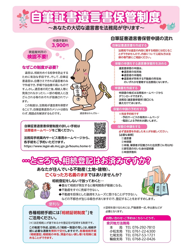 金沢地方法務局より、「自筆証書遺言書保管制度」について周知依頼が参りましたので、お知らせ致します。