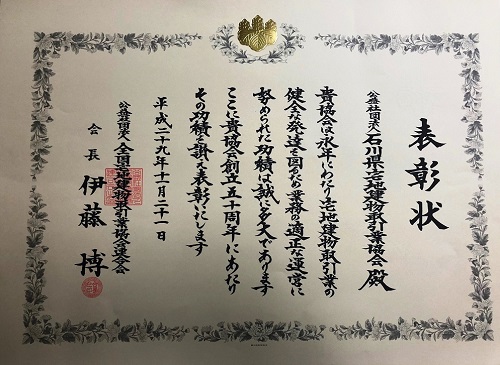 〔(公社)石川県宅地建物取引業協会 会長感謝状〕